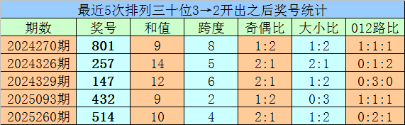 1、最近两期摆设三十位号码开出号码分袂为3和2,历史上十位号码邻接两期同期出现号码3和2的奖号共开出74期。最近五次下期开出号码为:801、257、147、432、514;