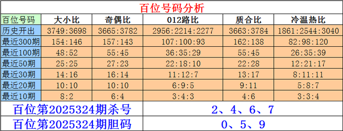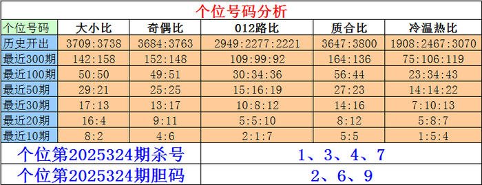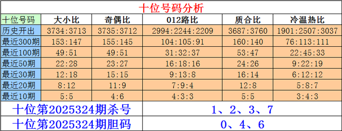 近期十位偶数发扬较冷,最近5期连出,运转走热,本期瞻望再出;该位温冷号码近期出现较少,最近2期都集开出温冷号码,本期防温冷号码无间回补。十位杀号:1237,胆码矜恤:046。